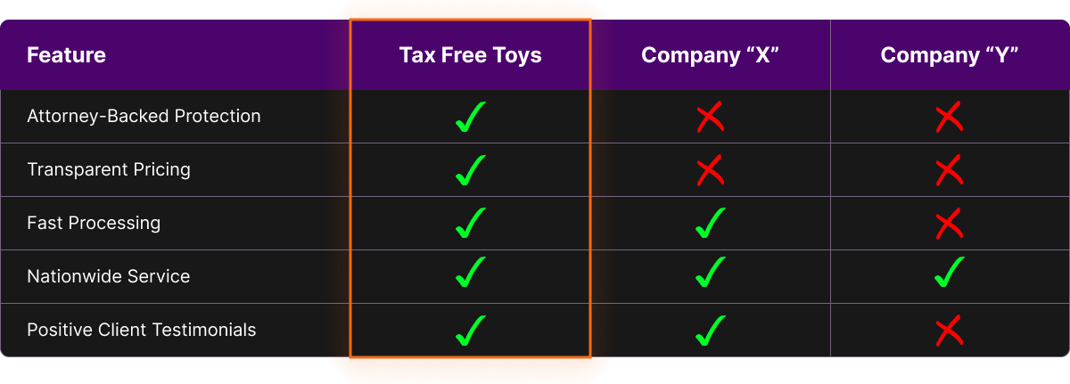 At Tax Free Toys, we don't leave your future in the hands of general customer service reps. Our approach is centered around providing you with direct access to legal professionals who understand the law inside and out, provide personalized advice, and protect your interests first.