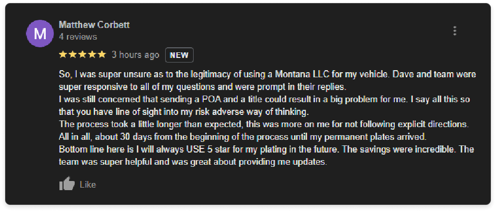 In contrast, another client, Sarah, came to us with a similar goal. From the outset, our attorneys guided her through every step. We ensured that her Montana LLC was set up correctly, her vehicle registration was compliant with all applicable laws, and all potential legal implications were thoroughly explained.