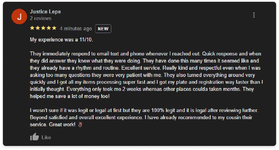 Time is valuable, and we ensure you don't waste it. With our expedited service, you can receive a temporary tag within just one business day after your Montana LLC is approved—or even faster if your LLC already exists. This allows you to start driving immediately without delays.